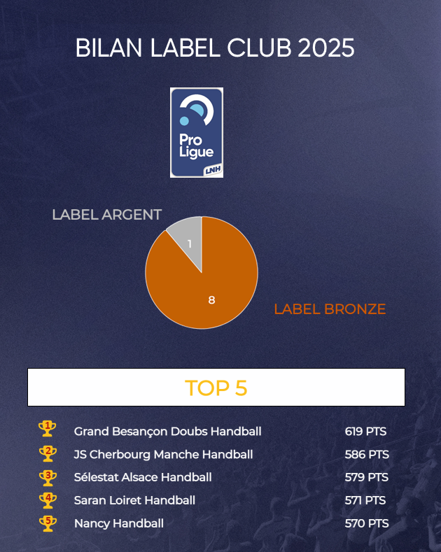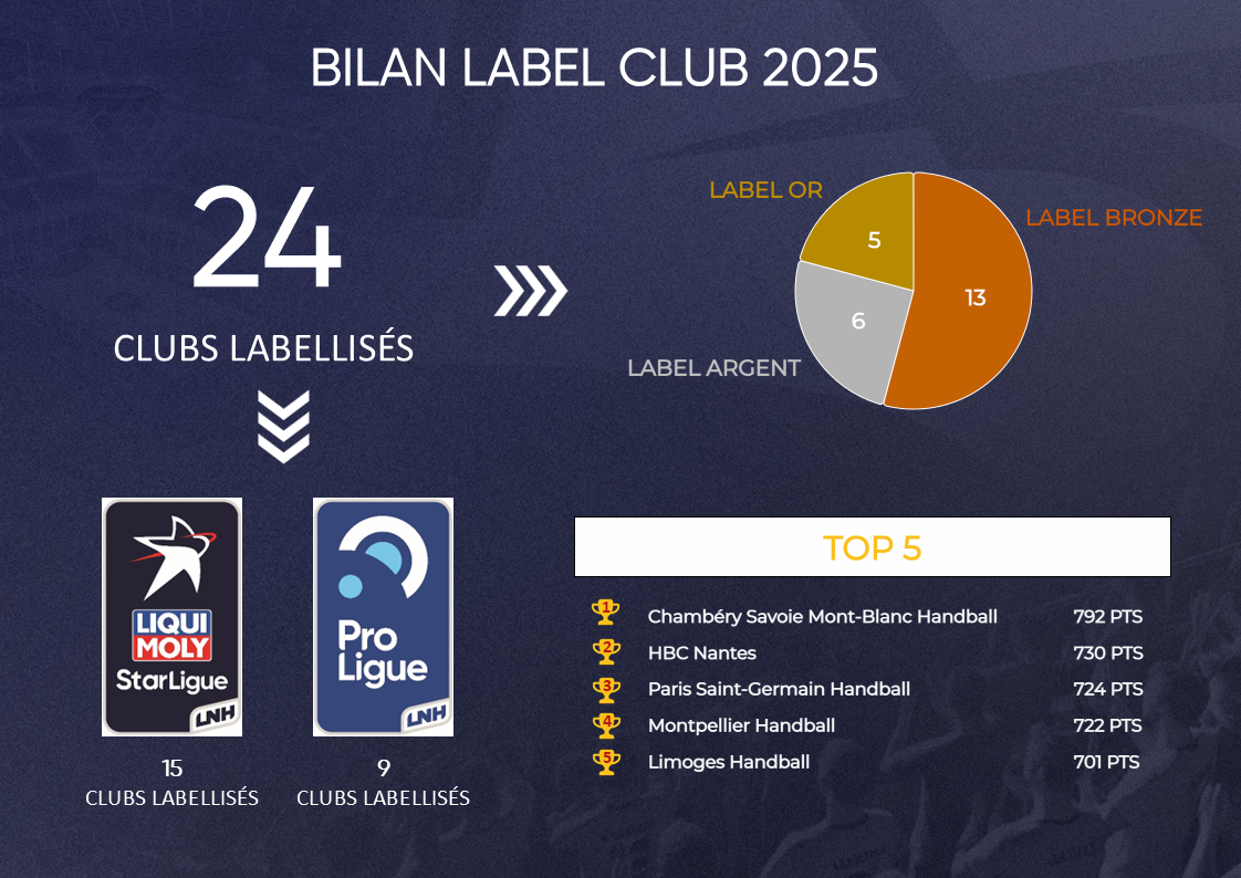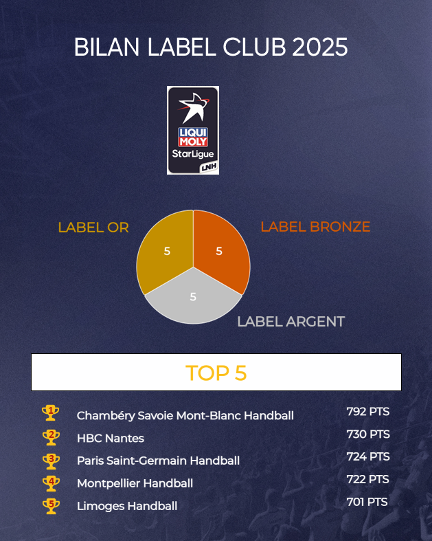 Comme l’édition précédente, les clubs de Chambéry Savoie Mont-Blanc Handball, HBC Nantes, Limoges Handball, Montpellier Handball et Paris Saint-Germain Handball conservent leur label Or.