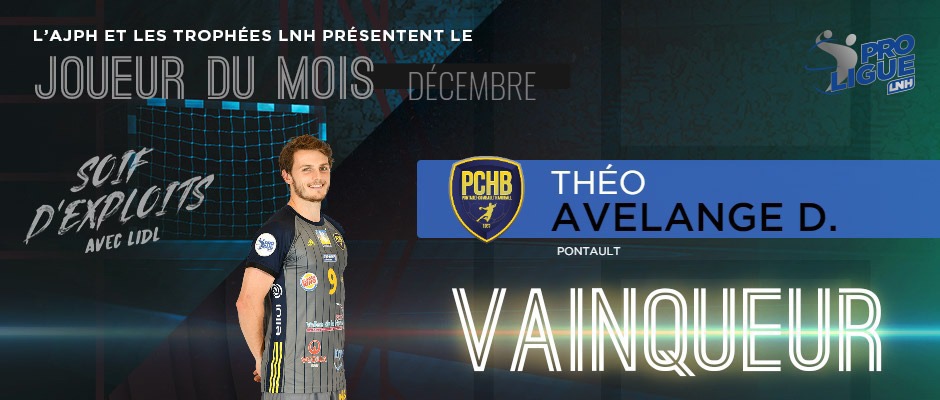 Avec 64% des suffrages, Théo Avelange Demouge a été élu joueur du mois de décembre. Les deux très bonnes performances de l’ailier droit du Pontault-Combault Handball (18 buts en 2 matchs à 86% de réussite, dont 9 penalties inscrits) lui ont permis de devancer le gardien de but cessonnais Robin Cantegrel (23%) et l’ailier gauche nancéien Yann Ducreux (13%). Théo Avelange Demouge, c’est :