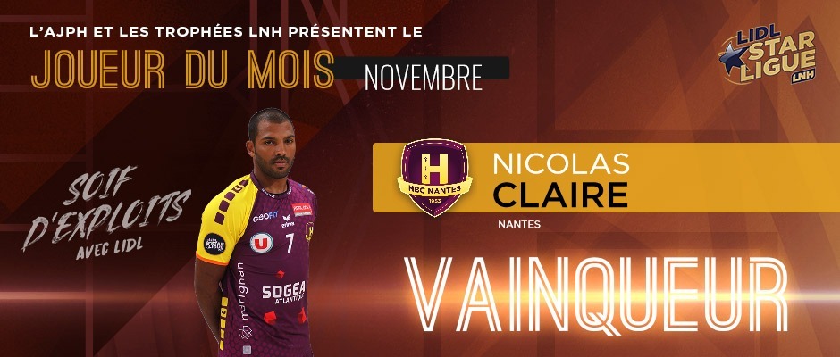 Après Nicolas Tournat en septembre, c'est un autre Nantais, Nicolas Claire, qui a été désigné joueur du mois de novembre. Le demi-centre de Nantes a en effet été désigné suite à un vote des internautes en recueillant 55% des suffrages. Il devance l'arrière droit de Montpellier, Melvyn Richardson (30%) et l’arrière gauche de Paris, Mikkel Hansen (15%).